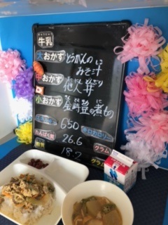 本日の給食は、「他人丼、とうがんのみそ汁、金時豆の煮もの、牛乳」でした。