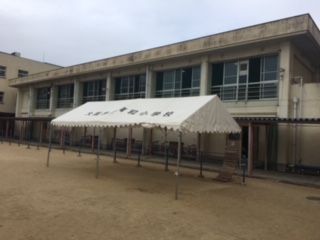 講堂横通路のミストのことは以前紹介させていただきましたが、今回のテントは、運動会の練習期間において、子どもたちが涼をとる場所として活用してもらおう、という“思い”で、管理作業員さんたちがせっせと準備してくださっていました。