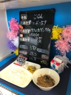 本日の給食は、「マーボーなす、ツナとチンゲンサイのいためもの、いり黒豆、ご飯、牛乳」でした。