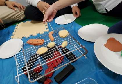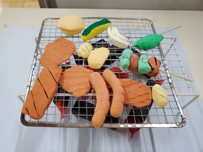 紙で作った炭の上に網を乗せます。「何から焼く?」「カボチャから。」「やっぱり、お肉やろ。」5年生を中心に、2年生、3年生が集まってきました。網の上に、紙粘土で作ったお肉、ソーセージ、野菜を並べます。リアルな出来栄えに気分も上がります。先生も招待して、紙皿とお箸を配ります。「焼けたで。○○君、これ食べて。」「つぎ、ミノ焼くよ。」「焼き鳥もあるよ。」焼き鳥には、網の焼き目まで付いていて、ほんとに美味しそうです。「なんか、お花見みたいやなあ。」なんて言いだす子もいて、ウキウキ楽しい時間をみんなで過ごしました。