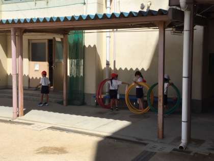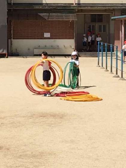 フープを揃えてよっこいしょ、と運ぼうとしていました。