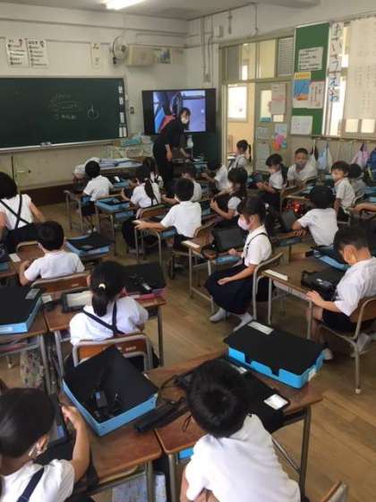 教室前を通ると、1年生の子どもたちが初めての「一人一台タブレット」を手にして、担任の先生から説明を受けていました。