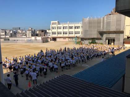 校長先生が「空を見てみましょう。」と一言。子どもたちは一斉に顔を上げます。空を見上げた子どもたちから「あおい〜」の声。今日は本当にさわやかな秋晴れです。