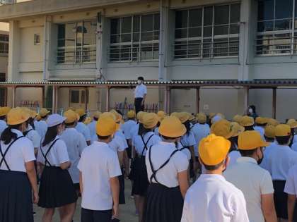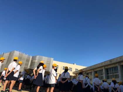 緊急事態宣言も解除され、ようやく全児童が運動場に集まって児童朝会を行うことができました。