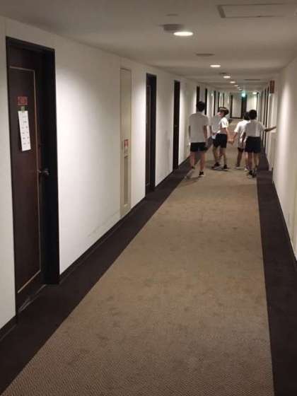 7時からは、入浴とおみやげ購入を並行して行いました。ユニットバスに慣れない子どもたちは、担任の先生に「先生〜、シャワーになりません」「で、どうしてるの?」