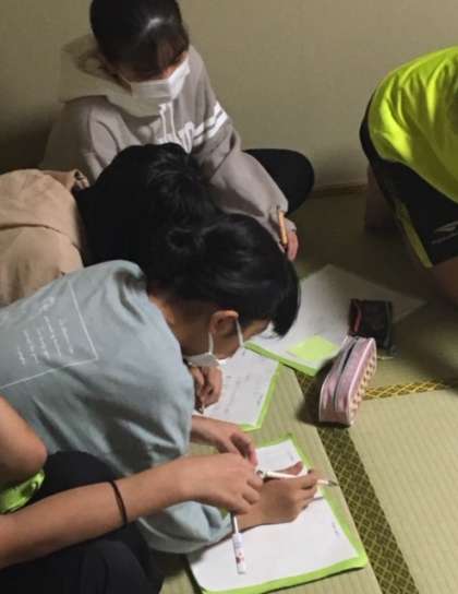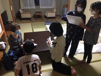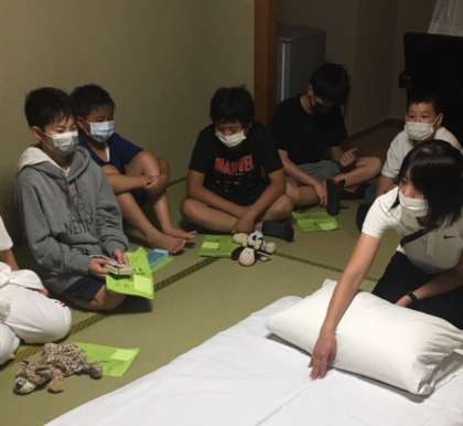 おみやげタイム後は、部屋に分かれて次々と係の子どもたちが集まり、担当の先生から様々に説明を受けています。室長会議に美化係、保健係などなど。なかには、同じ部屋の友だちに正確に伝えようと、メモを取りながら聞いている子もいました。