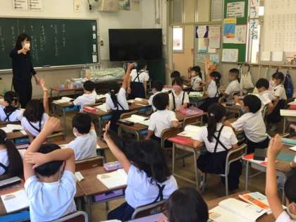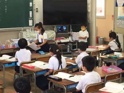 こちらのクラスでも、同じく「サラダでげんき」の学習中。今日の場面のさいごに、子どもたちが「動作化」をして、ちょうどみんなの前で発表しているところでした。