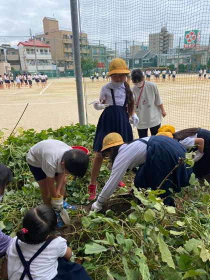 13日(水)のなかよしタイムは、お芋掘り。5月に学習園に植えたさつまいもを収穫しました。