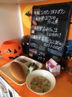 本日の給食は、「はくさいのクリーム煮、あつあげのごまじょうゆかけ、豚肉とさんどまめのオイスターソースいため、コッペパン、マーガリン、牛乳」でした。
