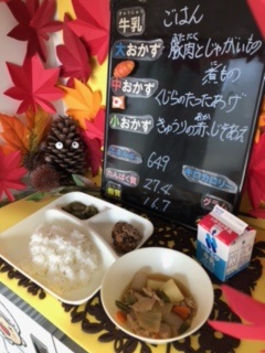 本日の給食は、「くじらのたつたあげ、豚肉とじゃがいもの煮もの、きゅうりの赤じそあえ、ごはん、牛乳」でした。