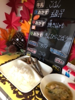 本日の給食は、「焼きししゃも、五目汁、きんぴらごぼう、ごはん、牛乳」でした。