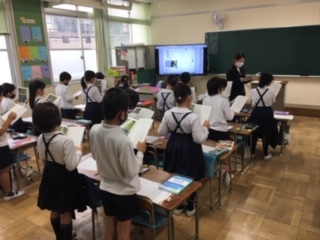 2年生は国語「どうぶつのひみつをさぐろう〜ビーバーの大工事〜」の学習でした。まずは、音読。マスク越しでしたが、それを感じさせないくらいしっかり声が出ていて、みんなの声が揃っていました。その後、ビーバーがダムを作ることができる理由を、写真を見たり、大事なところに線を引いたりしながら、体の特徴と関連付けて読みを進めました。先生に指名されたら「はい!」と返事。また、発表の途中でこどばが詰まってしまいそうになっても、周りの子どもが「がんばれ〜」と、そっと励ます姿が。自然で心優しいその様子に、きっといつもそうなんだろうな…とうれしく思いました。