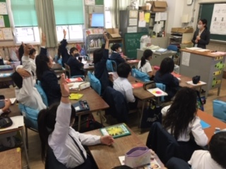 3年生は国語「漢字の読み方」の学習でした。「今日は、漢字ペアゲームをしますよ」の先生の声掛けに子どもたちはわくわく。担任の先生とのやりとりする様子を見て、「なるほど〜」「わかってきたよ」と子どもたち。続いて、同じ音読みの漢字セットを調べたり、ワークシートに記入したり、その言葉をつかった短文を発表したりしました。作業の途中でも、手をぴたっと止めて指示をきちんと聞こうとしている様子にも感心しました。「それ、いいね!」「早いね、すごい」とほめてもらって、子どもたちもうれしそうでした。