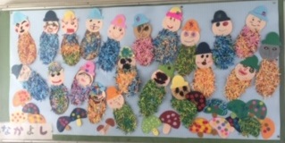 正門を入って運動場側に出て、一輪車や竹馬が置いてある渡り廊下を進むと、その突き当たりの校舎が「4号館」になります。その4号館の階段をあがるところに、大きな掲示板があるのですが、そこに何とも心がほっこりするような子どもたちの作品があります。