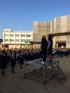 ここのところ連続で、運動場で全校朝会を行うことができています。