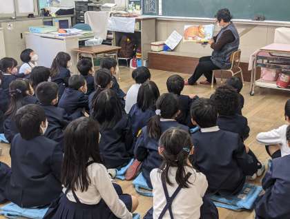 おはなし会の2日目。今日は1年生のクラスを、順にまわってくださいました。