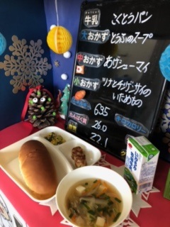 本日の給食は、「あげシューマイ、とうふのスープ、ツナとチンゲンサイのいためもの、牛乳、黒糖パン」でした。