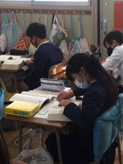 子どもたちはまず、「一人学び」の時間に、教科書の「言葉の広場」のページを参考にして、言葉集めからスタート。そのあとグループになって、それぞれが集めた言葉で、文づくりにチャレンジしました。