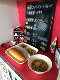 本日の給食は、「ポトフ、カレーソテー、桃のクラフティ、コッペパン、マーマレード、牛乳」でした。