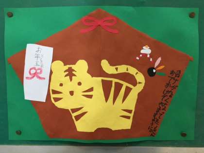 トラの周りにある、手づくりのお年玉袋や鏡もち・羽子板の羽、だるまさんや富士山のかわいいこと、かわいいこと。