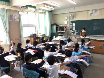「いーち、にぃ、さ〜ん…」と、子どもたちも先生もみんなで声を合わせ、「空書き」をして書き順の練習をしていました。