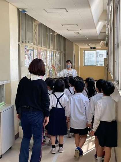 1年生が、担任の先生たちに連れられて、学校探検をしていました。