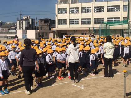 先週はあいにく運動場が雨で濡れていて使えませんでしたが、今日は、運動場でみんな集まって「全校朝会」を行うことができました。
