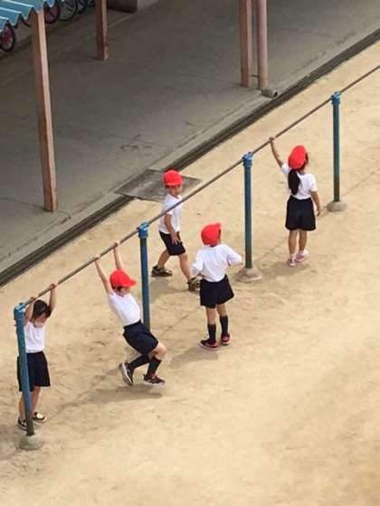 鉄棒の方では、これは先生に持ち方を教えてもらっているのかな。