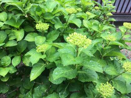 すると、以前はまだまだ小さくギュッと集まっていた紫陽花の花のつぼみが、また少し大きくなって膨らんでいました。雨に打たれて、葉っぱもつやつやです。