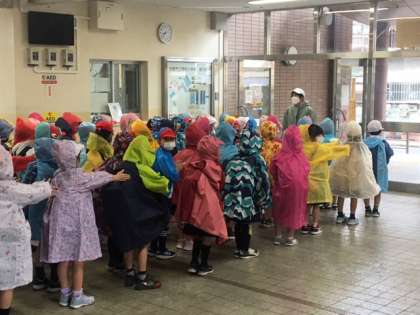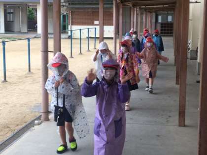 「行ってきます!」と、色とりどりのカッパを羽織って、声は元気な2年生。