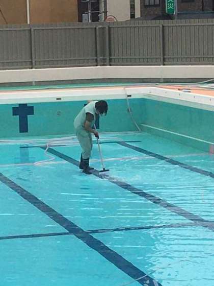 そして、そのプール清掃に向けて、先週から少しずつ管理作業員さんお二人が、高圧洗浄機やブラシを使って、一足お先に清掃に取り掛かってくださっています。