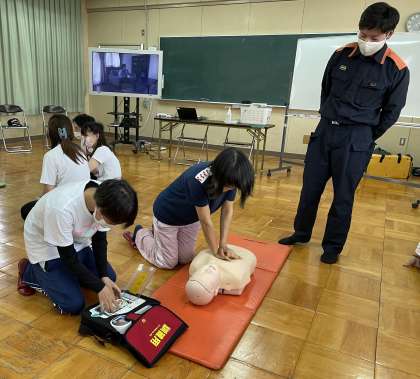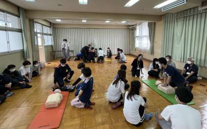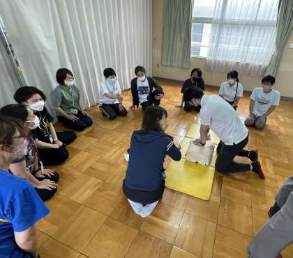 まもなく水泳学習がはじまります。6月20日(月)のプール開きを前に教職員対象として、東住吉消防署の方々をお招きし、救急救命講習を行いました。胸骨圧迫(心臓マッサージ)の手順やAEDを使い方を確認しました。毎年、いざという時に大切な命を救うことができるように研修をしています。