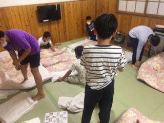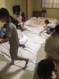 「ちょっと待って。このシーツって・・・あれあれ?」各部屋ごとに、布団敷きの時間です。