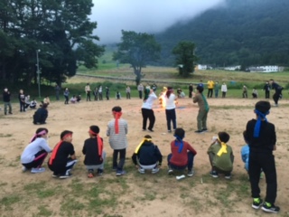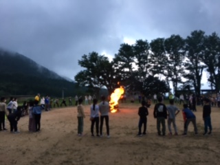 天候の関係で、今日に順延となっていたキャンプファイヤー。火の神と神様の弟子によって灯火され始まりました。まずがんばったのは、ファイヤー係の子どもたちです。みんなを楽しませたいという気持ちが滲み出ていました。後ろ姿からも、その雰囲気が伝われば幸いです。