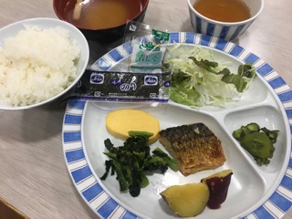 本日の朝食メニューは写真の通りです。ちょっと疲れ気味かな、と思っていましたが、何の何の。お茶、ごはん、お味噌などおかわりもしながら、今日の元気を蓄える子どもたちです。