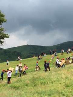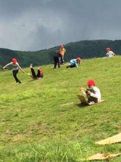 学校から持参した手作り段ボールの「そり」を手に、何度も坂道を往復しています。滑っては登り、滑っては登り。中には友だちに引っ張ってもらっている人もいました。みんな楽しそう!