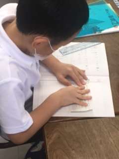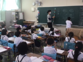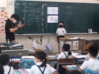 「まずは、線を引いて・・・」「左側にはいつものように・・・」算数ノートに、先生に言われなくともサクサク書き進める様子。ノートひとつを見ても、学習への取り組みが随分定着してきましたね。また、ミニミニホワイトボードに自分の考えを書いたり、それを使って説明したり。終わったら、がんばった友だちにみんなで拍手。先生も拍手・・・。