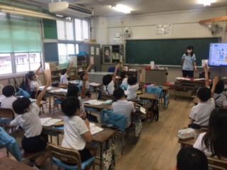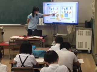 3年生です。外国語の時間に、電子黒板のイラストも見ながら楽しそうにやりとりをしています。一生懸命手をあげて、発表するときの発音のきれいなこと、きれいなこと。でも、間違ってもだいじょうぶ。自信を持って堂々と発表できる、その雰囲気が教室にあるって、すてきですね。