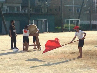 そんな隙間の時間でしたが、輪になって立つタイミングを揃えること等を確認している様子、太鼓の打ち方を先生から教わっている様子、旗の振り方を何度も試してより高みをめざしている様子など、応援団全体として前向きな雰囲気が、あちらこちらから漂っていました。夕陽に照らされ気温も高めですが、子どもたちのモチベーションも負けじと高い!です。