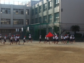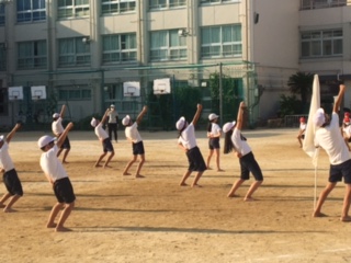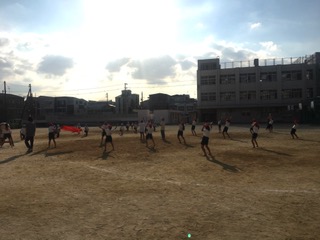 1日の終わりに響き渡るのは、応援団の子どもたちの声。観客がいない中、皆んな一生懸命です。誰も見ていない?・・・いえいえ、そんなことはありません。応援団担当の先生方はもちろん、体育主任の先生や前体育主任の先生、ふと校舎を見上げると、窓から様子を見守っている教職員の方々、そして下校途中の子どもたちも、柵の外から思わず立ち止まって、その様子を見ていました。西陽を浴びながら、ひとつになって取り組む姿が何ともカッコいい応援団です。