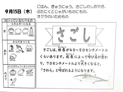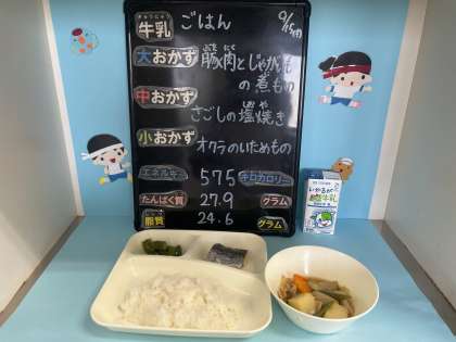 9月15日の給食はさごしの塩焼き、豚肉とじゃがいもの煮もの、オクラのいためもの、ごはん、牛乳でした。