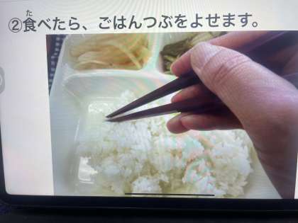 給食時間に1年生の教室を回っていると、食器のご飯粒がとれなくて困っている子が何人かいました。