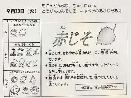 キャベツの赤じそあえはさわやかな香りで、少し酸味がある味つけです。運動会の練習で疲れた体を回復させてくれます。おいしいのでおかわりしている子も多かったです。