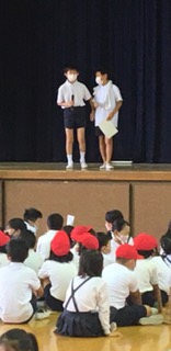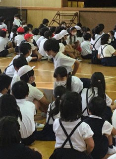 そう思いながら朝起きた子もいたかと思いますが、登校時刻にはあいにくの雨。でも、そこはさすが!の集会委員会。ちゃんと雨用プログラムも考えてくれていました。今朝のお題はイントロクイズ。音楽が流れるたびに「あっ!」「ねぇねぇ、何の曲?」とグループで曲名を相談。果たして、何曲正解できるかな?