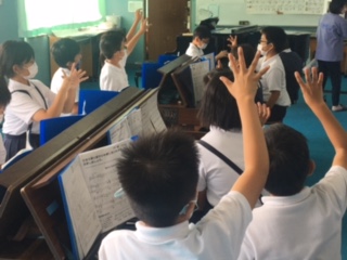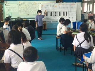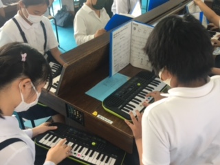 5年生。音楽の時間です。今日は電子オルガンやミニキーボードを使って、和音の練習。手を出して、どの指を使うか確認。「あ〜、とどかん!」「人差し指と中指じゃ、限界あるで」「あ、そうか親指使っていいのね」。友だちどうしでそっと教え合いながら、きれいな和音を響かせていました。