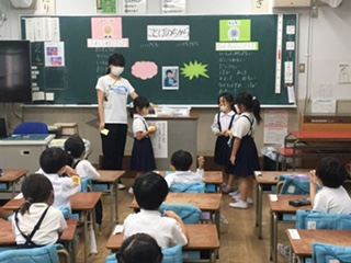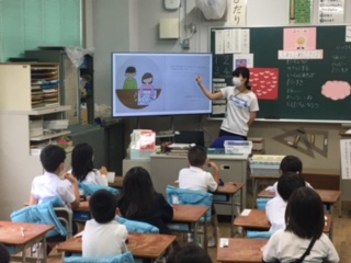 1年生、道徳の時間です。今日は、笑顔や泣き顔などの絵から、どんな言葉をかけられて、こういう表情になったのかを想像したり、その言葉を言われたときの気持ちについて、考えて発表したりしました。「きっと、この子は『あっちに行って!』ってなかまはずれにされたんじゃないかなぁ」「ぼくなら、『いっしょに遊ぼう』って言ってあげたい」「『友だちになろう』って言われて笑顔になった」など、少しずつ、「ことばって大事」「あたたかいことばを使っていきたいね」ということを、授業のなかで感じ取っているようでした。