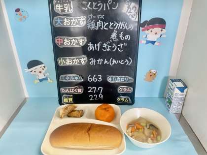 9月27日の給食はあげぎょうざ、鶏肉ととうがんの中華煮、冷凍みかん、黒糖パン、牛乳でした。