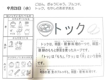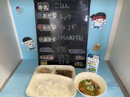 9月28日の給食はプルコギ、トック、もやしの甘酢あえ、ごはん、牛乳でした。