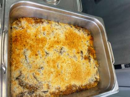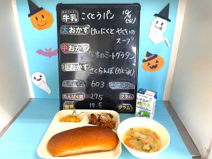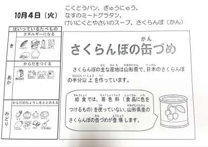 なすのミートグラタンはこんがりいい色に焼けました。市場に出回っているさくらんぼ(かんづめ)はきれいな赤色をしていますが、給食のさくらんぼ(かんづめ)は色が薄い黄色をしています。