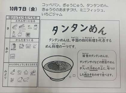 タンタンめんは四川料理を代表する麺料理の一つです。給食では野菜が入った汁めんの上に、肉みそをのせて食べます。肉みそがアクセントになって、さらにおいしくなります。